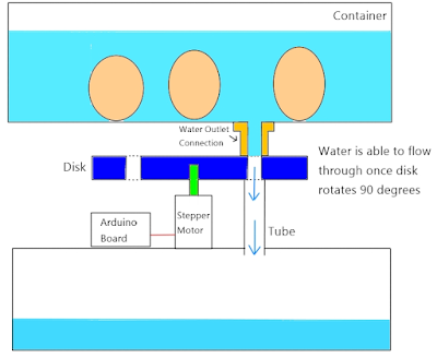 I designed the middle hole of the valve disk to be the same as the stem of the stepper motor so it fits snugly onto the stepper motor. Since the tube we purchased had an internal diameter of 12.7mm we also designed the outer diameter of the valve connections to be 12.7mm to fit the tube. The holes of the disk were designed to have a sufficient flow rate when water is being drained. The thickness and height of the disk and valve connection were chosen to have a smaller form factor for our valve mechanism.